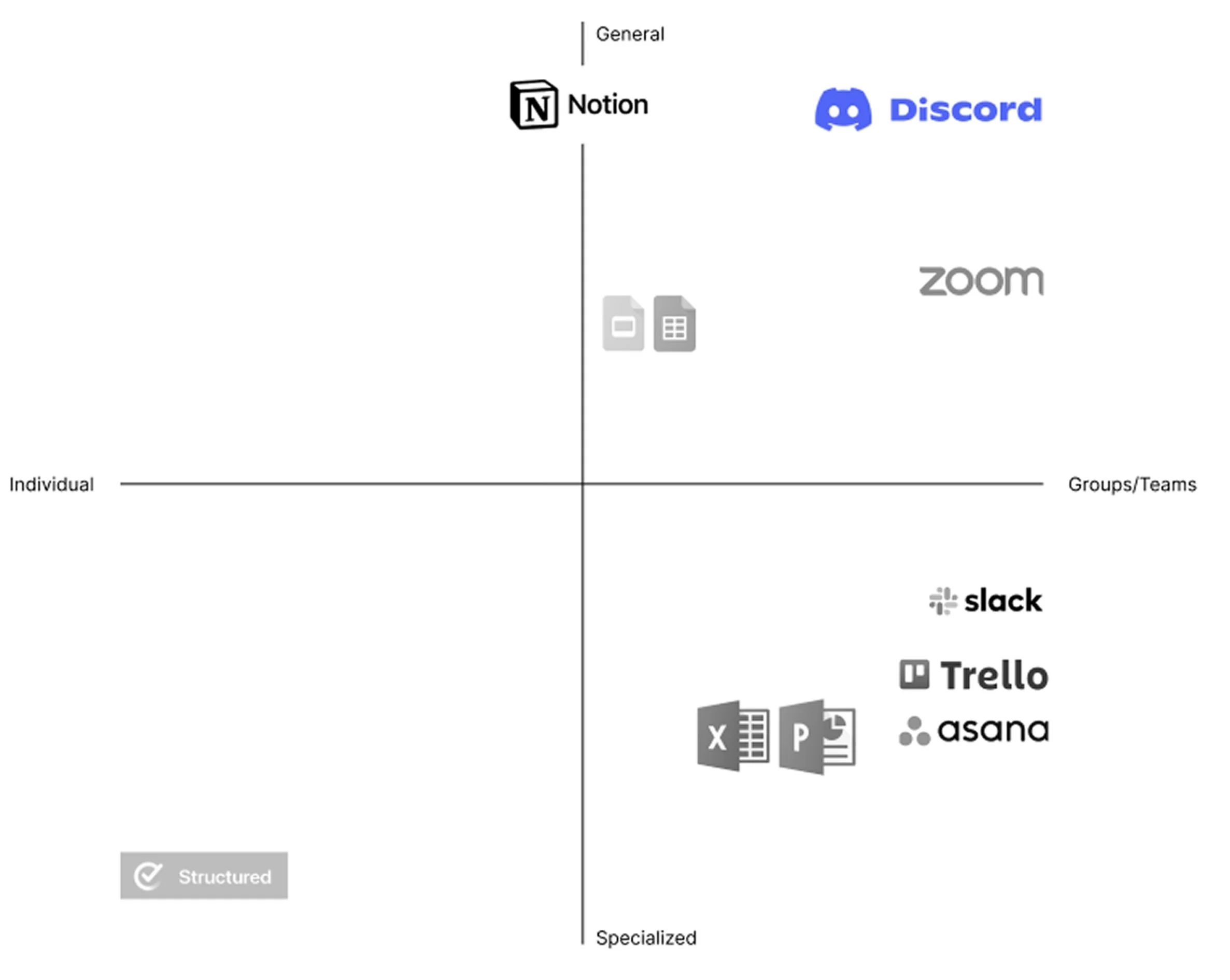 To understand how Discord compares in the productivity market, we analyzed relevant tools that support communication and collaboration. This metrics highlights how different platforms balance individual vs. group use and general vs. specialized functionality.