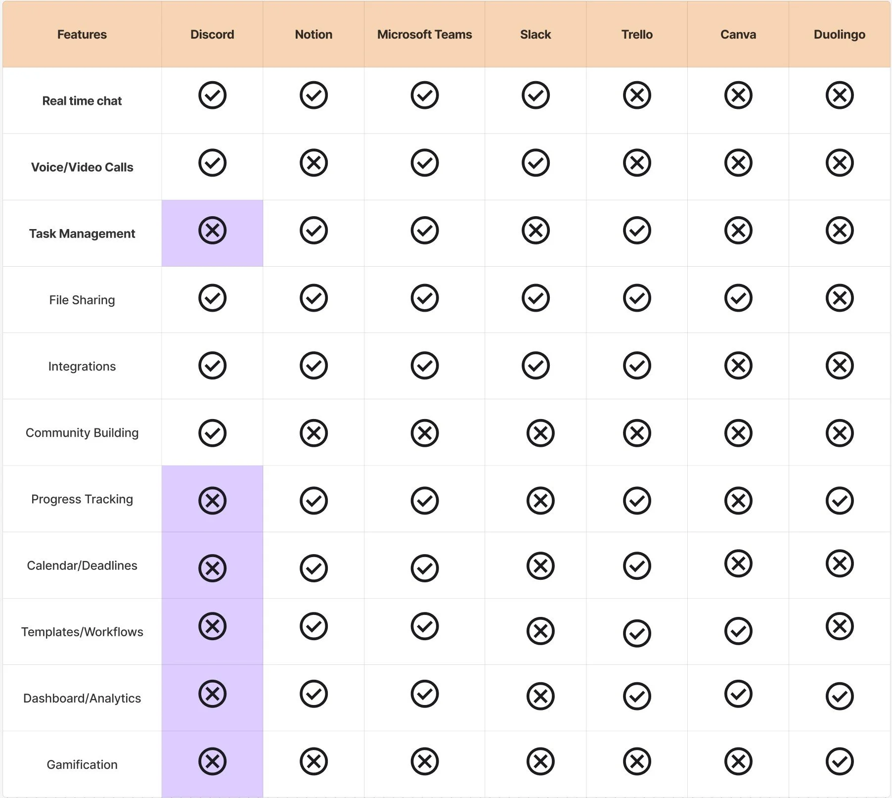 Discord lacks structured collaboration tools, overwhelming channels, and project-specific features like task management, Dashboards and assignment tracking, unlike Notion or Canvas.